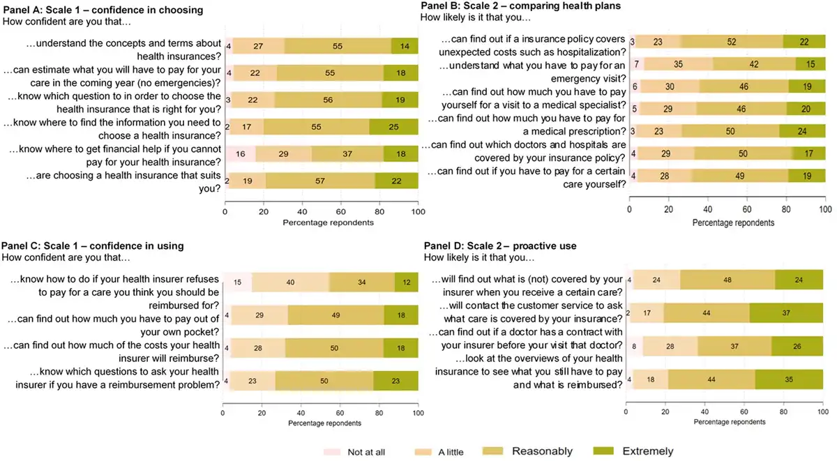 When looking at the use of health insurance (Panels C and D), while more than half of the sample is reasonably or extremely confident regarding the use of their health insurance plan, close to 60% of the sample does not know what to do if the health insurer refuses to pay for certain care that they think they should get reimbursed. Finally, while about 36% of the sample is unlikely to find out whether a doctor has a contract with their health insurer and therefore avoids extra costs, between 60 and 80% of the sample is proactive when using their health insurance (Panel D).
