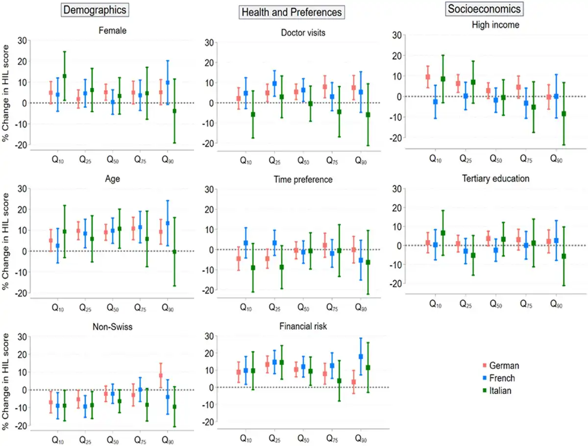 The last column of figure 2 shows no education gradient as hypothesized, suggesting that education level may not be a significant predictor of HIL score in Switzerland. Similarly, no income gradient is found, except for the first two quantiles of the HIL distribution in the Swiss German group, where wealthier individuals exhibit HIL scores between 5% to 10% higher than lower-income individuals. These results suggest that income significantly mitigates a low HIL in the Swiss German group when looking at individuals with the most difficulties navigating the Swiss health insurance system.