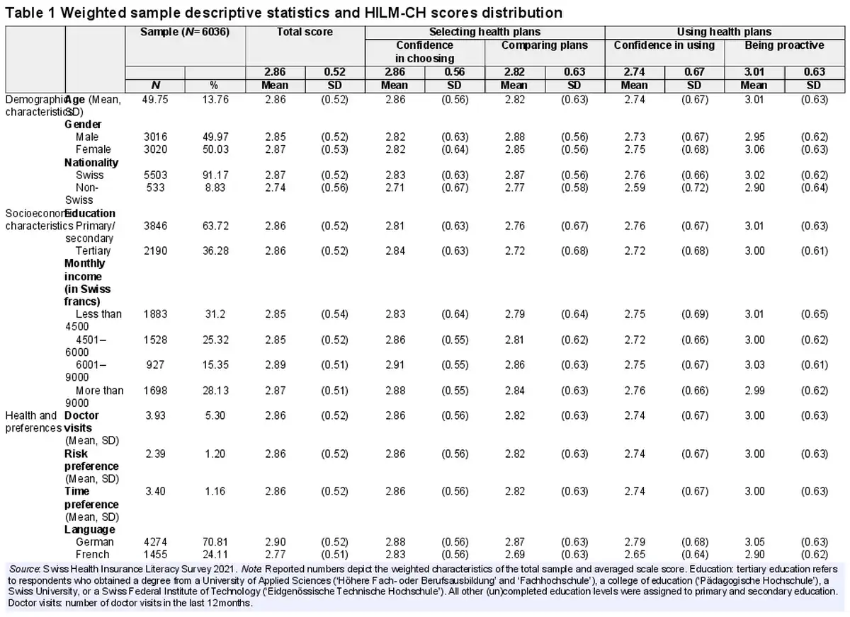 Previous research suggests an age gradient, with older individuals reporting higher HIL due to more experience, while non-Swiss individuals may have lower HIL due to language or system barriers. Higher socioeconomic status is expected to be associated with higher HIL, as educated individuals are more knowledgeable, and higher incomes may acquire health insurance knowledge independently. More doctor visits might relate to higher HIL as individuals become more familiar with the system. Preference variables could be critical in selecting and utilizing health insurance plans, as risk-averse individuals are informed about health insurance to avoid risk.,, Similarly, more future-oriented individuals may have greater confidence in their knowledge of health insurance decisions, making them more likely to be aware of health insurance details.