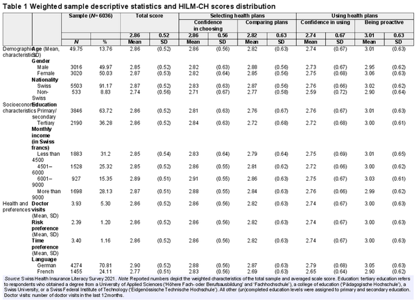 Table 1 presents the sample characteristics for the total HILM-CH score per domain. Of the 6036 respondents, the majority are from the German-speaking area of Switzerland, followed by the French- and Italian-speaking regions. The gender and age distributions are comparable to official statistics reported by the Swiss Federal Statistical Office, and about a third of the sample completed tertiary education. The median income is 6000 Swiss francs per month. The average number of visits to a doctor within the past 12 months is four. Furthermore, respondents demonstrate a tendency towards financial risk aversion (mean = 2.39, SD = 1.20) and are forward-looking (mean = 3.4, SD = 1.16).