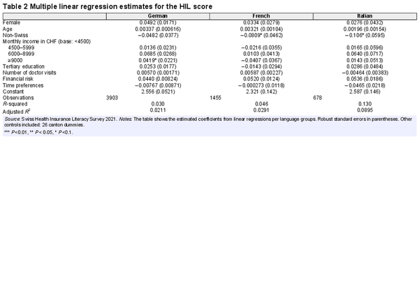 Results further indicate age and health gradients. Older individuals and individuals who have had more doctor visits in the last 12 months than their counterparts exhibit higher HIL scores in the German- and French-speaking regions, specifically on scales 2–4 (see Supplementary table A1). However, the magnitude of the effect remains low.