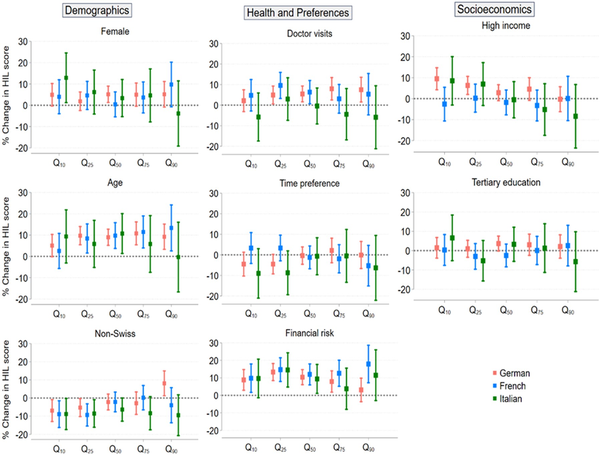 In the first column, although not statistically significant, women tend to have higher HIL scores than men in all three linguistic regions of Switzerland. Similar to OLS outputs, an age gradient is detected in the German and French regions, where HIL scores are approximately 10% higher for older individuals than their younger counterparts. Similarly, non-Swiss individuals exhibit significantly lower HIL scores in the lowest quantiles of the HIL score distribution compared to Swiss individuals. This significant difference vanishes with higher quantiles in all three language regions, except for the 90th quantile in the German region, where non-Swiss individuals have an average HIL score significantly higher by almost 10% compared to Swiss individuals.