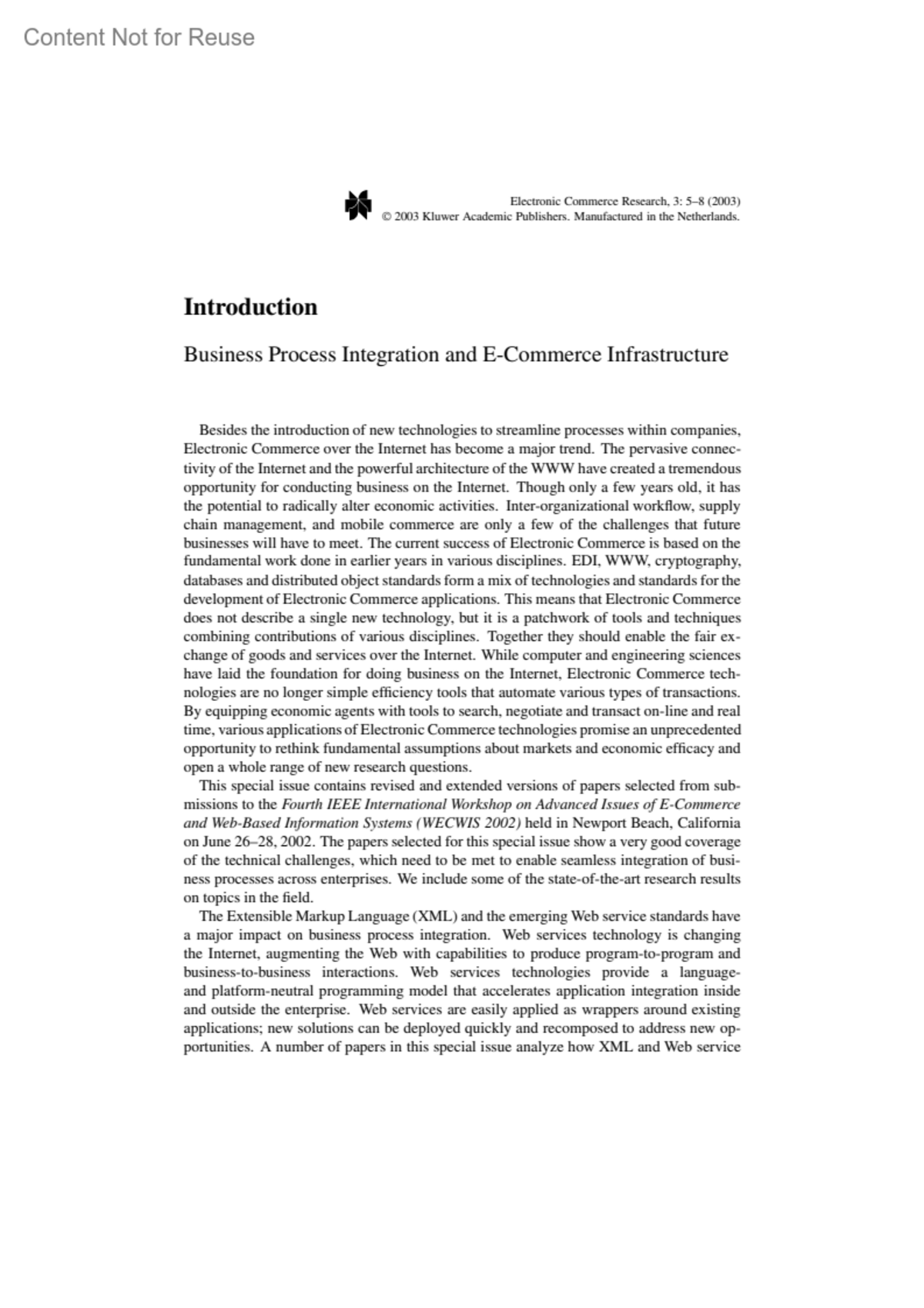 IntroductionBusiness Process Integration and E-Commerce InfrastructureBichler, MartinChung, Jen-YaoAuthor informationIBM T.J. Watson Research Center, Yorktown Heights, NY 10598, USA[email protected][email protected]Electronic Commerce Research 3(2):p 5-8, January-April 2003.Copyright ©2003 Kluwer Academic Publishers
