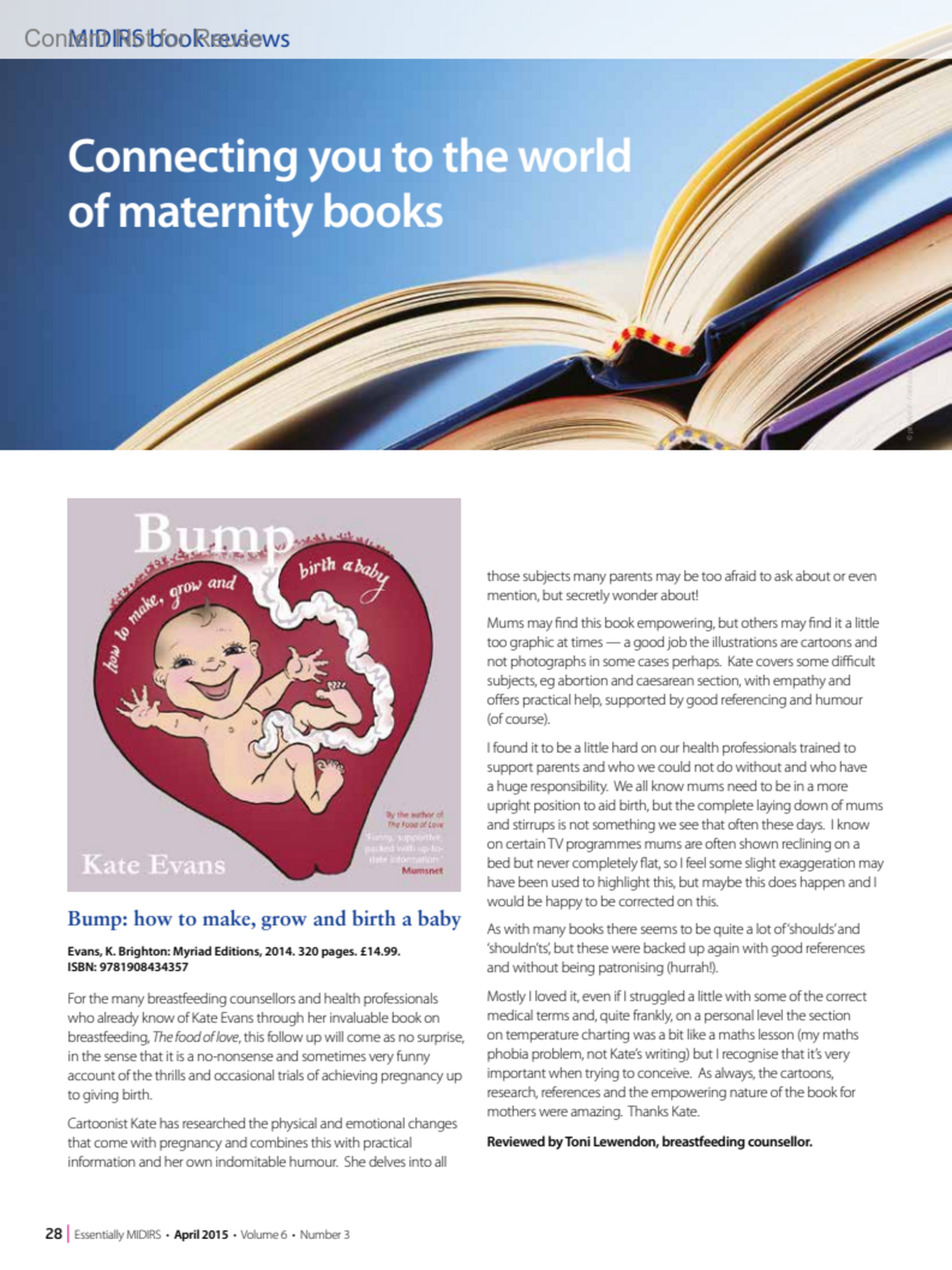 Bump: how to make, grow and birth a babyLewendon, ToniAuthor informationReviewed by Toni Lewendon, breastfeeding counsellor.Essentially MIDIRS 6(3):p 28, April 2015.Copyright ©2015 MIDIRS