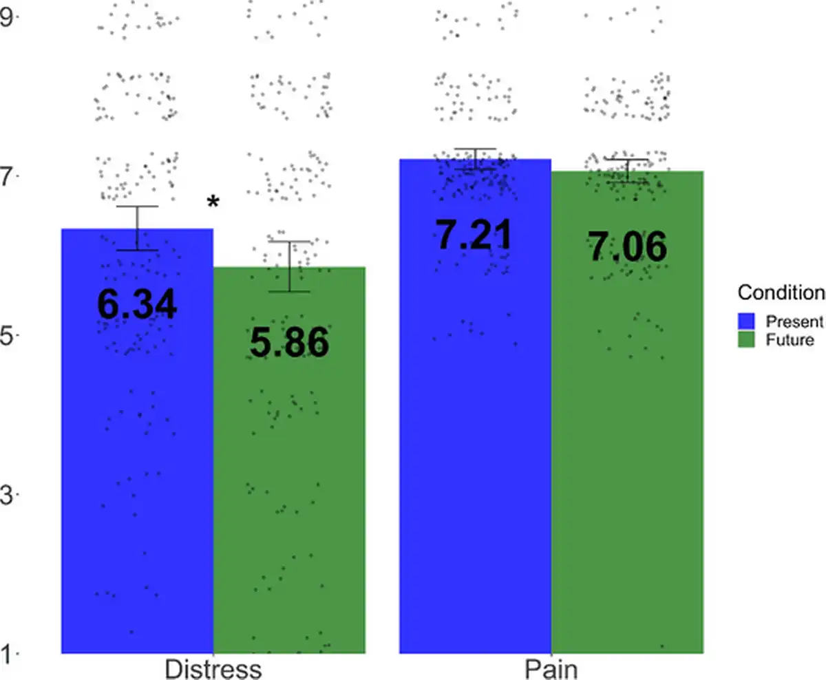 Participants were randomly assigned to one of two time conditions: present or future. They read a hypothetical scenario about a person named Mary who was in pain after breaking her ankle in either the present day (present condition) or 25 years in the future (future condition). Specifically, participants were told to imagine the following: