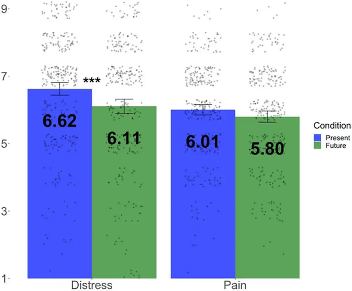 Additionally, we identified the oppositional effects that imagining the suffering of an identifiable future person has on the moral discounting of future generations’ well-being. Imagining a future person’s pain increased endorsements that the well-being of future generations is of equal moral importance to that of present generations. It also attenuated the general preference for helping fewer people now instead of a far greater number of people in the future. However, because empathic distress was lower when imagining another person’s future (vs. present) suffering, the effect of empathic distress on valuing lives equally is reduced when considering future suffering.