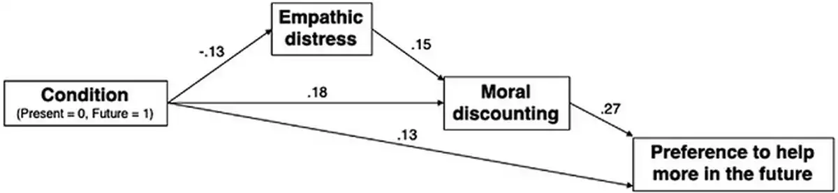 To understand how the intertemporal empathy decline impacts the effect of time condition on moral discounting and subsequent preferences, parameters were estimated for the path model depicted in Figure 4. This model allowed for assessing the direct effect that imagining the suffering of a future person had on moral discounting, as well as any indirect effect mediated by the identified intertemporal empathy decline.