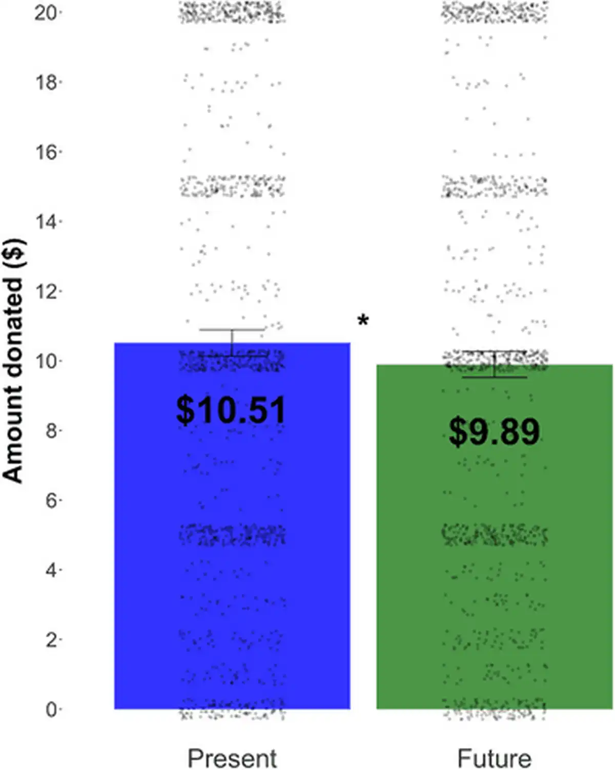Participants donated significantly more to charity in the present condition (M = 10.50, SD = 6.77) than in the future condition, M = 9.89, SD = 6.62; t(2446) = 2.30, p = .011 (one-tailed), d = 0.09; see Figure 5.