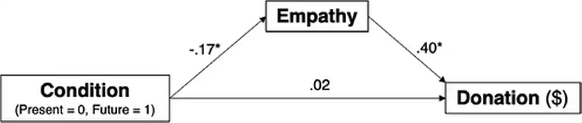 To determine if the intertemporal empathy decline partially explains the decrease in giving to a future-oriented charity, we estimated parameters for the path model depicted in Figure 6 using Amos. As can be seen, the intertemporal empathy decline completely mediated the effect of time condition on donation. That is, the decreased empathy people felt for the suffering of a future target explained their reductions in financial donations, indirect effect = −.91, p < .01, 95% CI [−1.14, −0.69].