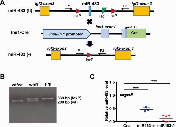 To investigate the physiological function of miR-483 in pancreatic β-cells, we generated a mouse model with β-cell-specific deletion of miR-483 by crossing miR-483 floxed mice (miR483fl/fl) with Ins1-Cre mice (Jackson Laboratory) (Fig. 1A and 1B). Given the high expression of miR-483 in β-cells (), we used islets as a surrogate to verify miR-483 deletion in β-cells. The islets were isolated from 10 weeks of homozygous miR483–/– (completely deleted), heterozygote miR483+/– (1 copy deleted) and Cre control mice, and total RNA was extracted and analyzed for miR-483 expression by real-time RT-qPCR. Compared with Cre mice, miR-483 transcripts displayed almost 90% decrease in miR483–/– mice and 50% decrease in miR483+/– mice (Fig. 1C), suggesting a successful generation of a mouse model with β-cell-specific deletion of miR-483.