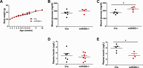 miR-483 deficiency increases blood glucose and decreases plasma insulin in HFD-fed mice. A. Body weight was measured weekly starting at 4 weeks old when mice fed a high-fat diet (n = 8–12 per group). (B,C) Blood glucose was measured in Cre and miR483–/– mice at 12 weeks old (B) and 17 weeks old (C) after 6 hours of fasting (n = 5-8 per group). (D,E) Plasma insulin was measured in mice at 12 weeks old (D) and 17 weeks old (E) after 6 hours of fasting (n = 4-8 per group). Values are means ± SEM. *P < .05 vs control.