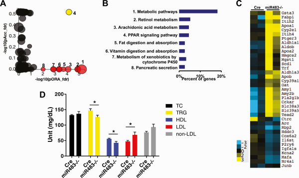 miR-483 deficiency induced alterations of blood lipid profile. (A) Differentially expressed genes (false discovery rate <0.01) between HFD-fed miR-483–/– and Cre mice (14 weeks old) were generated by RNA-sequencing using Illumina HiSeq 4000. The data was analyzed in the context of pathways obtained from the Kyoto Encyclopedia of Genes and Genomes (KEGG) database. Pathway were plotted in the 2 terms of the 2 types of evidence computed by iPathwayGuide: over-representation on the x-axis (pORA) and the total accumulation on the y-axis (pAcc). Each pathway was represented by a single dot, with significant pathways shown in red, nonsignificant in black, and the size of each dot is proportional to the size of the pathway it represents. Both p-values were shown in terms of their negative log (base 10) values. (B) Top 8 significantly enriched “biological pathways” in miR-483–/– mice. Data were analyzed by Fisher/binominal test with Bonferroni-adjusted P value (n = 33 genes). (C) Heatmap of selected differentially expressed genes involved in lipid metabolism and insulin secretion revealed by iPathwayGuide. (D) Whole blood lipid profile in HFD-fed mice at 20 weeks old. Blood samples were drawn and the concentrations of total cholesterol (TC), triglyceride (TRG), high-density lipoprotein (HDL), low-density lipoprotein (LDL), and non-LDL were determined using enzymatic colorimetric assays. Values represent the means ± SEM of 5 mice per group. *P < .05.