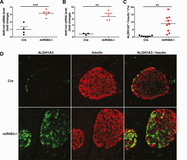 We further examined the ALDH1A3 expression in pancreas sections by immunofluorescent staining (Fig. 5D). ALDH1A3-positive cells were very rare in HFD-fed Cre mice. However, ALDH1A3-positive cells were remarkably increased in the islets of HFD-fed miR483–/– mice. Notably, most of the ALDH1A3-positive cells were colocalized with insulin-producing β-cells. Quantitative analysis revealed that the number of ALDH1A3+ /Insulin+ cells per islet increased almost 15-fold in miR483–/– compared with Cre mice (8.98% ± 1.85 vs 0.57% ± 0.19 in Cre, P < .001) (Fig. 5C). These results confirmed that miR-483 deficiency specifically induced ALDH1A3 expression in β-cells.