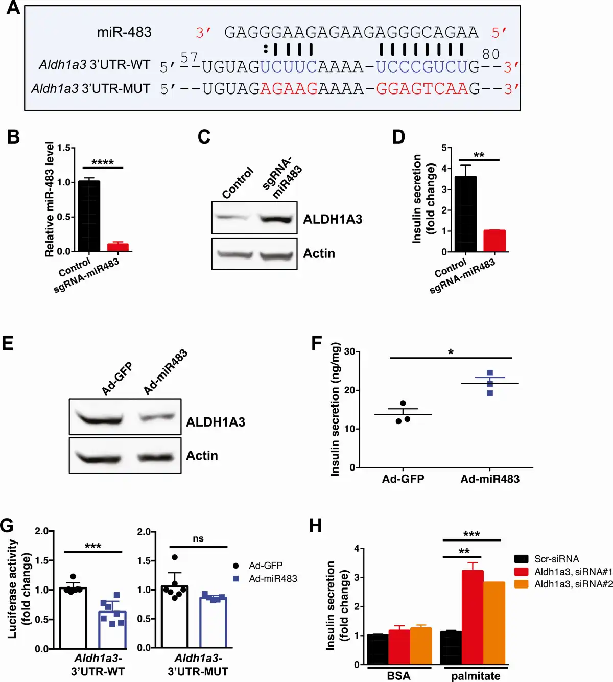 To validate that the impaired insulin secretion caused by miR-483 deletion was due to increased ALDH1A3 expression, Aldh1a3 was silenced in sgRNA-miR483 cells using Aldh1a3 siRNA. Two days after siRNA transfection, cells were further treated with or without palmitate for 24 hours. As shown in Fig. 6H, compared with scrambler (Scr) siRNA control, Aldh1a3 knockdown by 2 different siRNA oligos significantly restored the reduction of insulin secretion in sgRNA-miR483 cells when cells were treated with palmitate, although no effects were observed in Aldh1a3 siRNA transfected cells in the absence of palmitate. Taken together, the data indicated that miR-483 preserved insulin secretion by targeting Aldh1a3 under stress conditions.