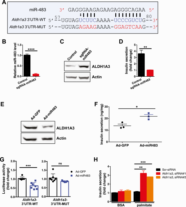 In parallel, miR-483 was overexpressed in sgRNA-miR483 cells by infection with recombinant adenovirus overexpressing miR-483 (Ad-miR483) (Fig. 6E). After 48 hours of infection, western blot validated that the elevated ALDH1A3 in sgRNA-miR483 cells was dramatically reduced by Ad-miR483 when compared with Ad-GFP control. In contrast to reduced insulin secretion by miR-483 deletion, Ad-miR483 infection enhanced insulin secretion in isolated islets when compared with the Ad-GFP control (Fig. 6F).