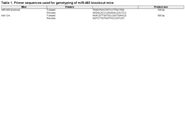 The loxP construct of miR-483 was created by homologous recombination using miR-483 flanked with loxP sites without interfering with insulin-like growth factor 2 (Igf2) host gene splicing (Fig. 1A). The target vector was electroporated into BA1 (129/SvEv × C57Bl/6) (Hybrid) embryonic stem cells and positive clones were selected for expansion at the Genious Targeting Laboratory, Ronkonkoma, NY. The floxed miR-483 mice (miR483 fl/fl) were backcrossed to C57BL/6J for 10 generations for use in this study. Mice with β-cell-specific knockout of miR-483 (miR483–/–) were generated by crossing miR483 fl/fl with Ins1-Cre mice (Stock # 026801; The Jackson Laboratory), knock-in mice expressing Cre recombinase from the endogenous Ins1 locus driven by mouse Ins1 promoter (). Genotyping of all mice was performed by polymerase chain reaction (PCR) using DNA from tail biopsy (Fig. 1B). PCR primers for genotyping are listed in Table 1. All mice were housed in a pathogen-free animal facility at Michigan Technological University with a 12-hour light/dark cycle with ad libitum access to regular chow food or HFD (containing 60% kcal fat, D12492 from Research Diets) in accordance to requirements. The procedures were approved by the Animal Care Committee at Michigan Technological University.