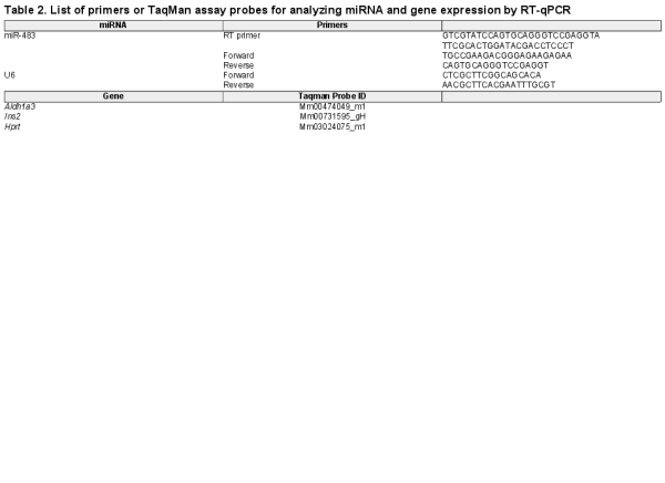 Total RNA was extracted from islets using an miRNeasy kit (Qiagen) according to the manufacturer’s instructions and treated with DNase I (Qiagen). A total of 250 ng of high-quality RNA (RNA integrity number [RIN] ≥8) was reversely transcribed to cDNA with a High-Capacity cDNA Reverse Transcription Kit (Thermo Fisher). Quantitative reverse transcription (RT)-PCR (RT-qPCR) was performed with Power SYBR Green PCR Master Mix (Thermo Fisher) for miR-483 and TaqMan™ Gene Expression Master Mix (Thermo Fisher) for mRNA as described (). RT-qPCR was performed on a StepOnePlus™ system (Applied biosystem) using the following program: 10 minutes at 95°C for activation of reverse DNA polymerase and 40 cycles of 95°C for 15 seconds, 60°C for 1 minute. All samples were run in duplicate, and the expression of mRNA and miRNA was determined using the relative comparison method (ΔΔCt), with hypoxanthine guanine phosphoribosyl transferase (Hprt) mRNA as mRNA internal control and U6 as the miRNA endogenous control, respectively. The primers used in the study are summarized in Table 2.