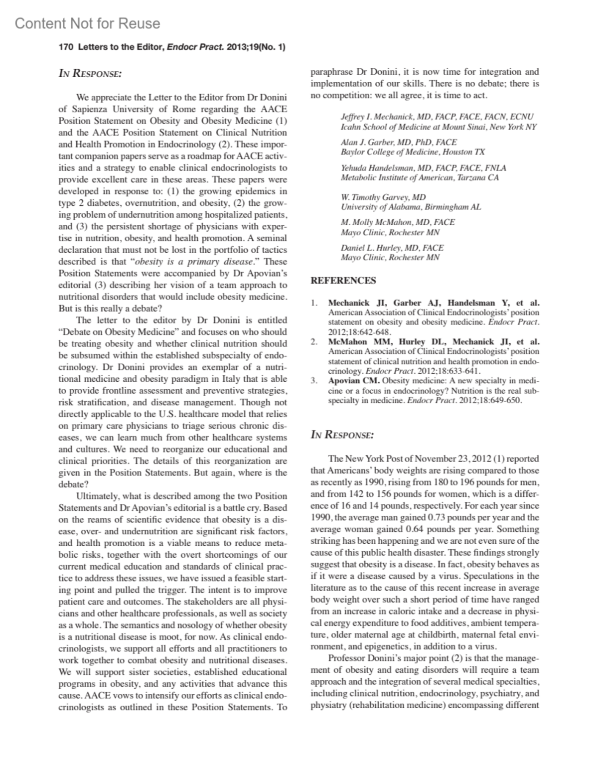 Debate on Obesity MedicineApovian, Caroline M. MD, FACP, FACNAuthor informationDepartment of Endocrinology, Diabetes, and NutritionBoston University School of Medicine88 East Newton Street, Robinson 4400, Boston, MA 02118Email:[email protected]Endocrine Practice 19(1):p 170-171, January-February 2013.Copyright © 2013 Allen Press