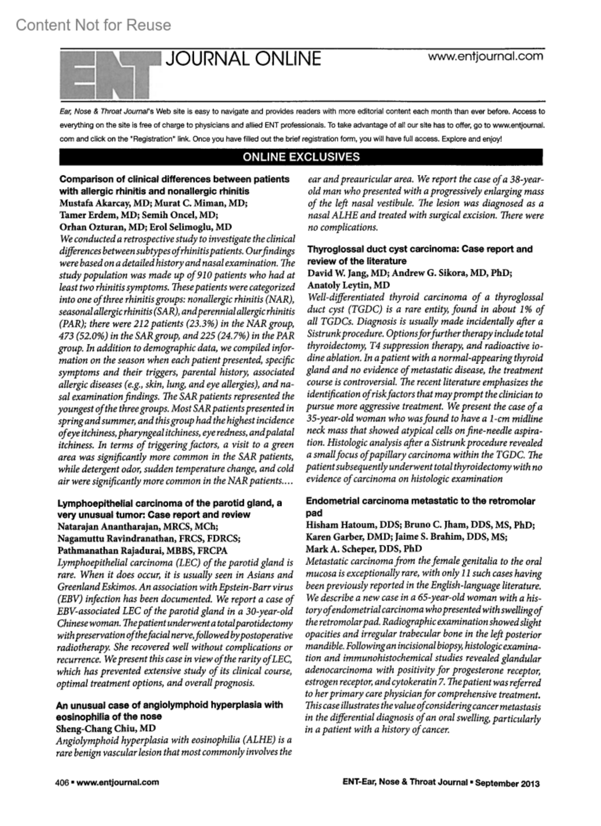 Journal OnlineEar, Nose & Throat Journal 92(9):p 406-408, September 2013. | DOI: 10.1177/014556131309200901Copyright ©2013Sage Publications