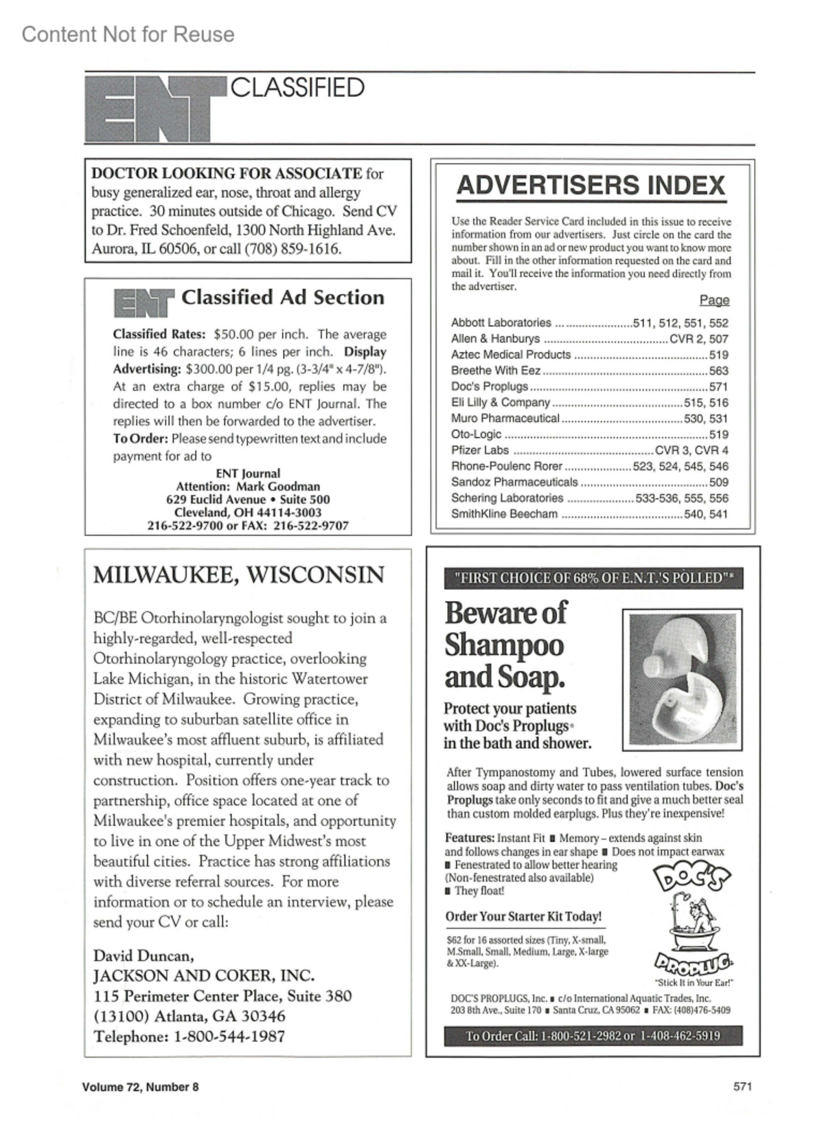 ClassifiedEar, Nose & Throat Journal 72(8):p 571-572, August 1993. | DOI: 10.1177/014556139307200818Copyright ©1993Sage Publications