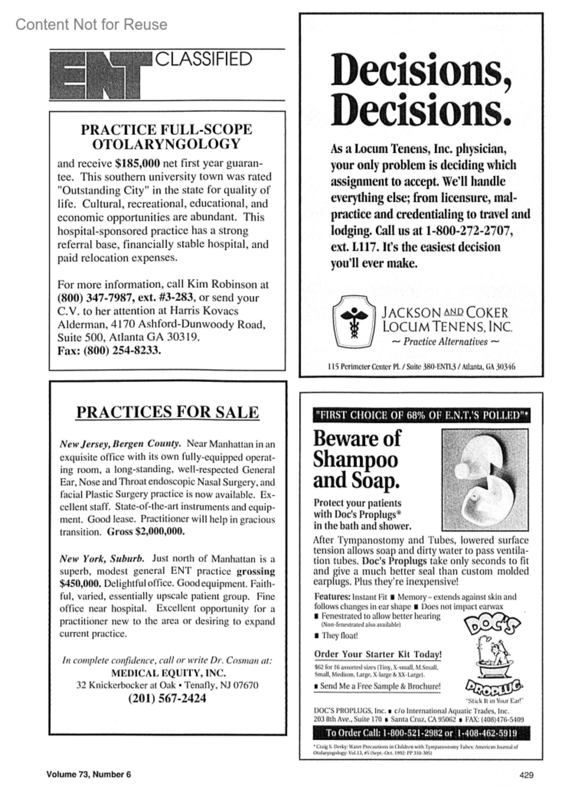 ClassifiedEar, Nose & Throat Journal 73(6):p 429-432, June 1994. | DOI: 10.1177/014556139407300621Copyright ©1994Sage Publications
