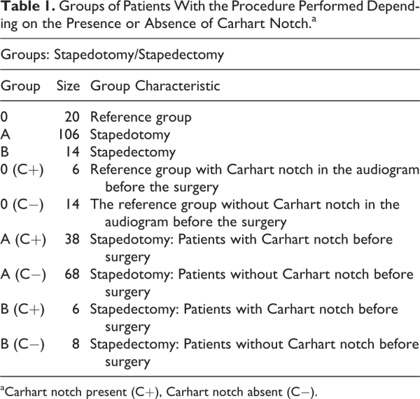 The analysis included 140 patients operated on for the first time due to otosclerosis at our department in 2010 to 2016. The youngest patient was 19 years old and the oldest was 62 years old. The average age was 39.31 years. The study group consisted of 107 women aged 19 to 62 years (average age: 40.33 years) and 33 men aged 27 to 59 years (average age: 38.23 years). The aim of the analysis was to divide patients into 2 groups depending on the surgery performed (stapedotomy [A], stapedectomy [B]). In addition, a reference group was isolated from the group whose members underwent stapedotomy. The reference group consisted of patients in whom, apart from complete immobilization of the stirrup base in the oval window, no other lesions were found in the middle ear and the osseous conduction of the ear operated in the presurgical tonal audiogram fell within the range of 0 to 20 dB. The reference group consisted of 20 patients, 16 women and 4 men (Table 1). In order to carry out a detailed analysis, patients in particular groups were divided into subgroups (0: Carhart notch present [C+], Carhart notch absent [C−], A: [C+], [C−], B: [C+], [C−]) depending on the occurrence of Carhart notch in the tonal audiogram before the surgery or lack thereof (Table 1). The study looked for the answer to the question of whether the presence or absence of Carhart notch in the presurgical tonal audiogram affects the final outcome of the otosclerosis surgery.
