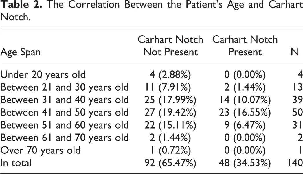 In the assessment of Carhart notch in the tonal audiogram prior to surgical treatment depending on the patient’s age, no statistically significant differences were found (χ2 = 7, 76, P = .08 and Cramér V = 0.22; Table 2).