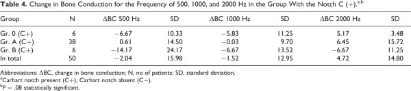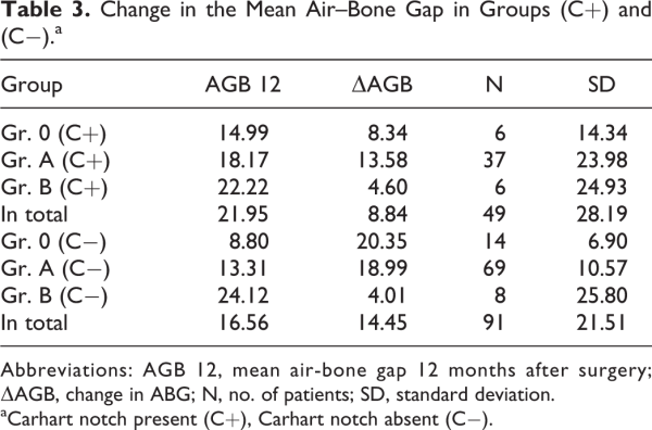 In the next stage of the analysis, the degree of hearing improvement was determined in terms of closing the air–bone gap (ABG) 12 months after the surgery, depending on the occurrence of Carhart notch in the presurgical audiogram. In the analysis of variance after the treatment, the following results of changes in the mean ABGs were obtained, P < .05 (Table 3).