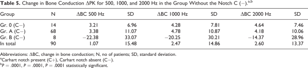 Within the analyzed groups, there were no statistically significant changes in the bone conduction threshold values in the studied frequencies after the surgery. In the analysis of groups of patients without the Carhart notch in the presurgical tonal audiogram, the following results were obtained (Table 5).