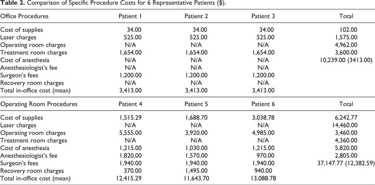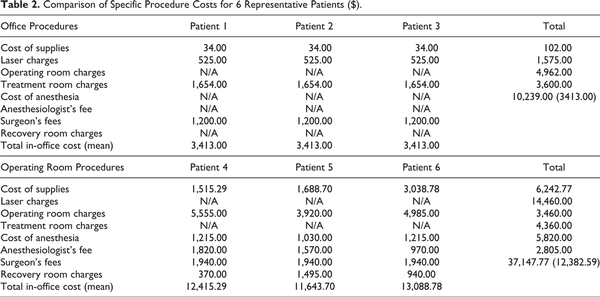 Based on the billing records of the 6 representative patients, the average hospital charges were $3,413.00 for the office procedures and $12,382.59 for the operating room procedures (table 2). The difference was $8,969.59 per patient per procedure.