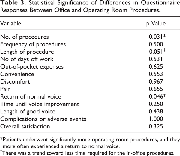 There were two statistically significant differences in outcomes: patients underwent significantly more operating room procedures (p = 0.031), and they more often experienced a return to normal voice after an office procedure (p = 0.046). In addition, office procedures tended to require less time, but the difference in procedure times did not quite reach statistical significance (p = 0.051) (table 3). When patients were asked which procedure took less time, 16 of the 17 (94.1%) said the office procedure did. When asked which of the two types of procedure cost them less in out-of-pocket expenses, 12 of 16 patients (75.0%) said the office procedure did.