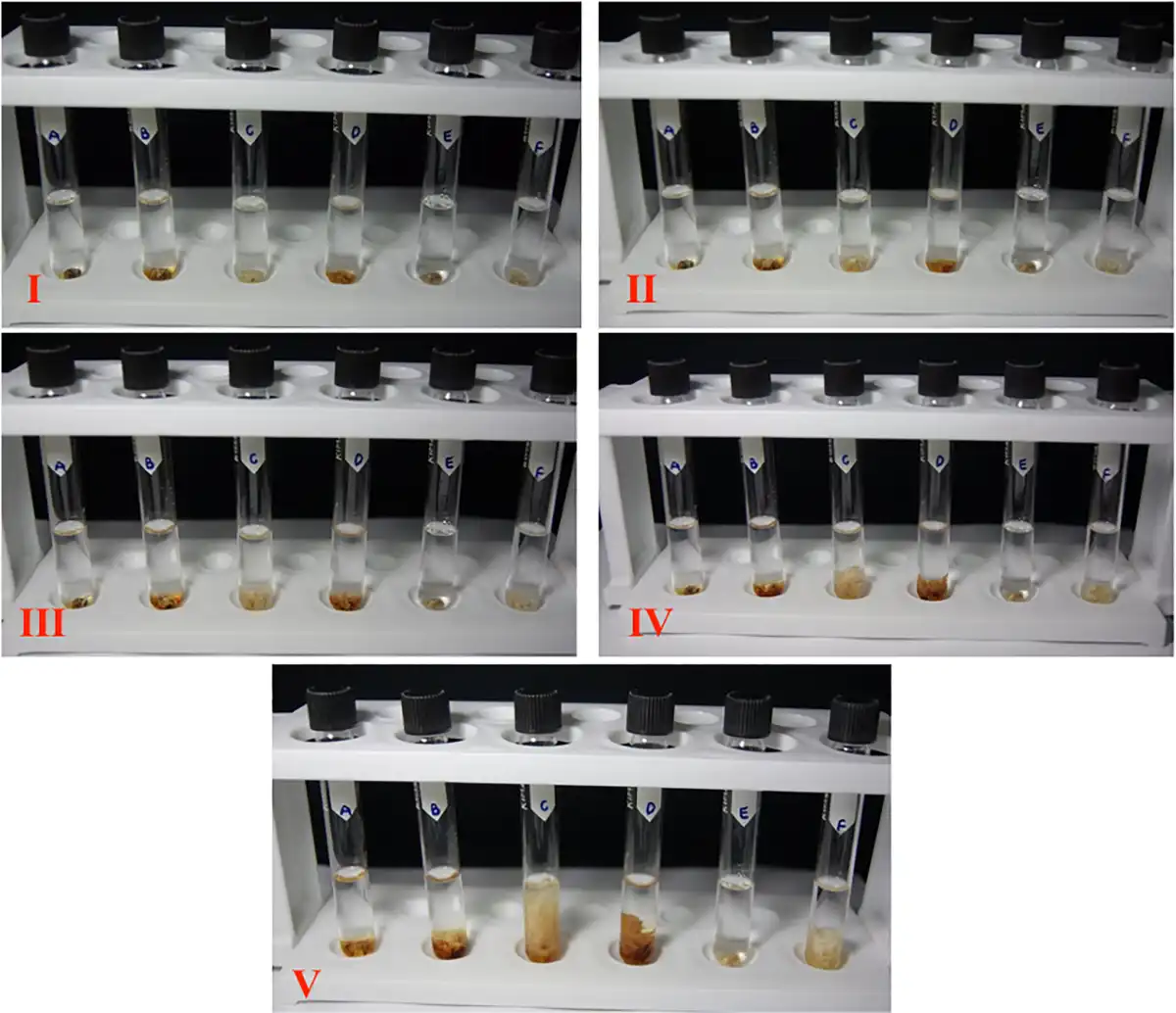 Degree of cerumen disintegration in 6 different solutions in one batch.