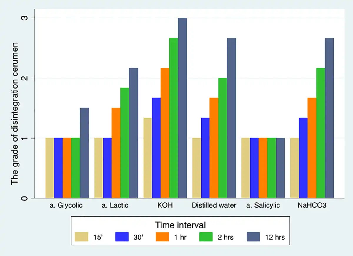 The median grades assigned to the solutions over time showed that the potassium hydroxide solution was the most effective since it yielded a different grade at each time interval and caused substantial disintegration after 12 hours. Both distilled water and sodium bicarbonate were approximately equally effective in dispersing the cerumen, whereas lactic acid achieved a smaller degree of disintegration. Salicylic acid and glycolic acid did not cause any disintegration (Figure 2).