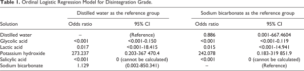 The dissolution activities of the solutions were compared via 2 ordinal logistic regression models that assigned distilled water and sodium bicarbonate as the reference groups (Table 1).