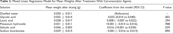 The associations between the cerumenolytic solutions and weights of residual undissolved cerumen samples are shown in Table 2. Cerumen samples subjected to distilled water (reference group) had a mean weight of 0.030 ± 0.011 g after drying. Only sodium bicarbonate had a negative coefficient (−0.001), indicating a greater effectiveness in reducing cerumen weight compared to distilled water; however, this was not statistically significant. On the other hand, potassium hydroxide and lactic acid yielded positive coefficients of <0.001 and 0.008, respectively; these results were not statistically significant. The mean cerumen weights for glycolic acid and salicylic acid were significantly higher than that for distilled water (P < .05), indicating the lack of effectiveness of these 2 cerumenolytic agents.