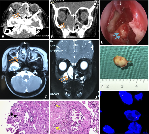 CT Images of the ABC patient: The yellow arrow indicates the complete opacification of the right ethmoid sinuses and nasal cavity. The boundary of the tumor was not clear and had uneven enhancement. The mass compressed the maxillary sinus and the medial wall of the orbit. C.D: MRI Images of the ABC patient: The yellow arrow indicates a unilateral pattern of sinus opacification within the right nasal cavity and ethmoid sinus. The lesion demonstrated multiple fluid–fluid levels and peripheral enhancement, considering cyst solid change with hemorrhage. E.F: A yellow-white elliptical osteoma with a size of about 5 mm in diameter was seen at the patient’s middle nasal nail base plate. G.H: HE (hematoxylin and eosin) staining of the ABC patient’s pathological specimen. (G) The black arrow indicates multinucleated giant cells. ×200. (H) The yellow arrow indicates hemosiderin laden macrophages. ×200. I: The schematic diagram of FISH (fluorescence in situ hybridization) detection in children with ABC. It is suggested that USP6 breaks and translocates in tumor cells and is accompanied by loss of the green signal.