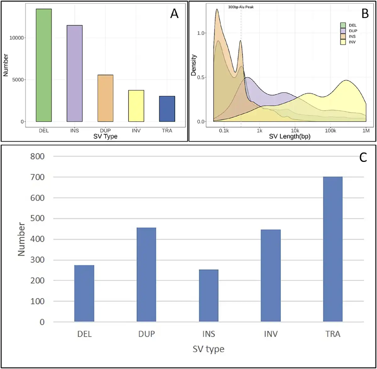 Histogram of the number of structural variations in the whole genome of the child. B: Distribution map of structural variation length of the whole genome in the child. C: The number of somatic SV that only appeared in the child’s sample.