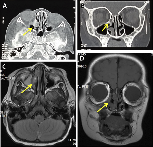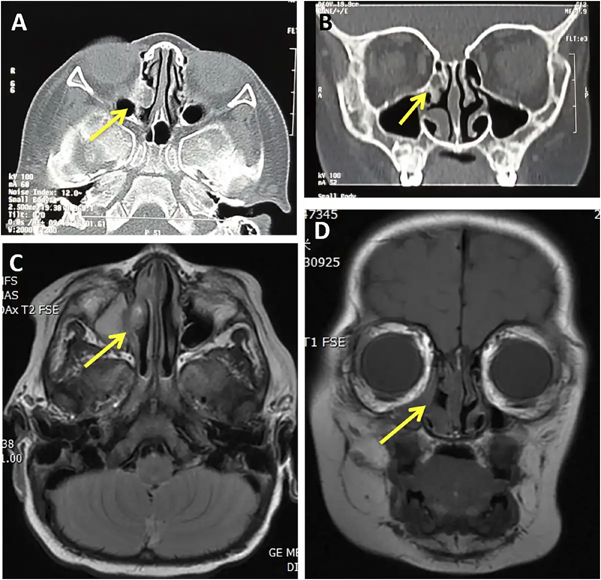 The patient’s CT (A, B) and MRI (C, D) of paranasal sinuses after operation: The yellow arrows show the changes in the operative area 1 year after operation: no tumor recurrence, a small amount of local hyperosteogeny and mucosal thickening.