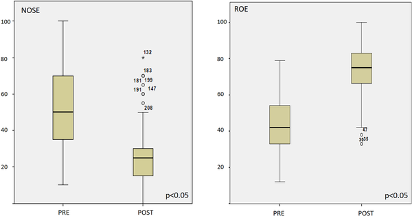 Many tools have been developed to measure patient improvement in QoL after surgery. We chose to use the ROE and NOSE questionnaires because they had been validated , and they are simple, wieldy, and easy to understand. These questionnaires evaluate preoperative QoL and how it changes during the postoperative period, thus evaluating the degree of patients’ satisfaction.