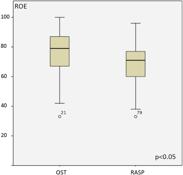 Analysis of the ROE scale showed no significant difference in the 2 groups in the preoperative aesthetic state (P = .409) with 40.5 in the osteotome group and 42.7 in the rasp group. The mean ROE score of the entire sample preoperatively was 41.23; the mean postoperative score was 74.16 (P = .000; Figure 4). The osteotome group showed a higher improvement of the postoperative QoL (77.0) compared to the rasp group in postoperative ROE scale (68.3; P = .005; Figure 5).
