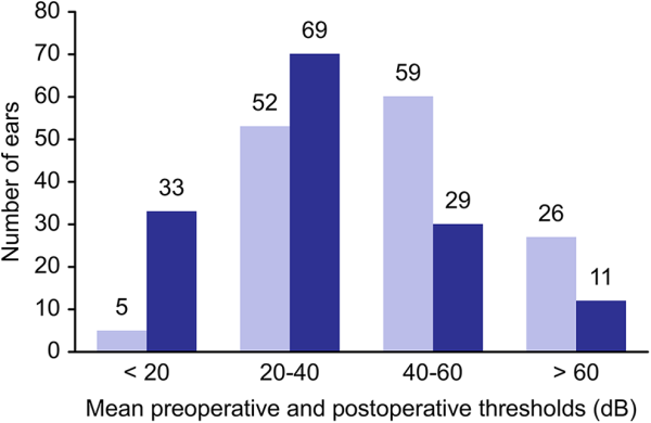 In 33 (23.2%) ears, we obtained a final mean AC threshold of <20 dB; in 69 (48.9%) ears, we obtained a mean AC threshold between 20 and 40 dB; in 29 (20.4%) ears, we obtained a mean AC threshold between 40 and 60 dB; and finally in 11 (7.7%) ears, we obtained a mean AC threshold of >60 dB.