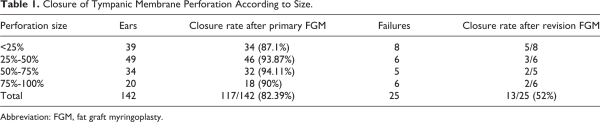 In 1962, Ringenberg first reported the use of a fat graft (FG) to repair tympanic perforations, including large perforations. In this series of 65 patients, 26% of perforations were larger than 30% to 40% and included some total perforations. Despite the large size of these perforations, the success rate was 86%.