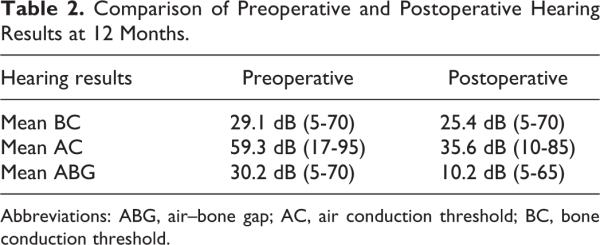 We evaluated the results of hearing tests performed before and 12 months after surgery, following the criteria reported previously. , The hearing frequencies used were 500, 1000, 2000, and 3000 Hz. We calculated the mean air conduction (AC) threshold, bone conduction (BC) threshold, and percentages of patients with a pre- and postoperative average air–bone gap (ABG) of <20 dB.