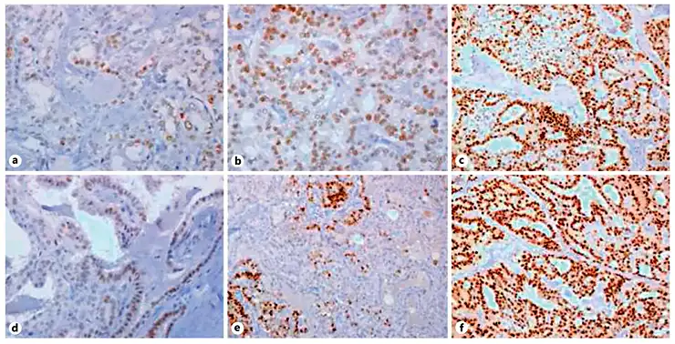 Immnunohistochemical ER-α (a-c) and PR (d-f). The intensity of expression (brown color) progressively increases from the right to the left panel.
