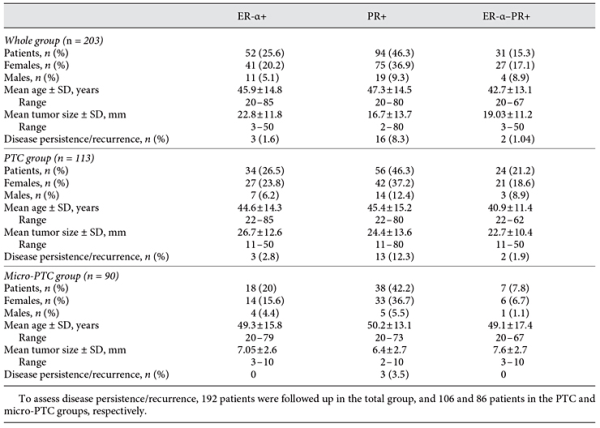 In the present study, we evaluated the immunohistochemical expression of ER-α and PR in a large series of 203 classical PTC. In particular, the study sample included similar proportions of micro-PTC (<10 mm) and PTC (>1 mm). This balance allowed us to comparatively investigate differences, if any, in ER-α and PR expression in these two clinical entities, and to correlate the immunohistochemical findings to the disease outcome.
