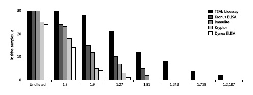 Comparison of results for TSHR Ab binding immunoassays and a TSAb bioassay on undiluted and diluted (1:3 to 1:2,187) samples from 30 hyperthyroid patients with untreated GD. The bars indicate the number of positive samples for the TSAb bioassay, Kronus ELISA, Immulite, Kryptor, and Dynex ELISA, respectively. On undiluted samples, differences were noted between the bioassay and the Kryptor (p = 0.063) and Dynex (p = 0.031). Already on the 1:3 dilution, marked differences were observed between the TSAb bioassay and the Kronus ELISA (p = 0.031), Immulite (p = 0.016), Kryptor (p < 0.001), and Dynex ELISA (p < 0.001). On both 1:9 and 1:27 dilutions, major differences were noted between the TSAb bioassay and all 4 binding assays (all p < 0.001). On the 1:81 dilution, differences were still observed between the TSAb bioassay and the Kronus ELISA, (p = 0.039) and Immulite (p = 0.002).