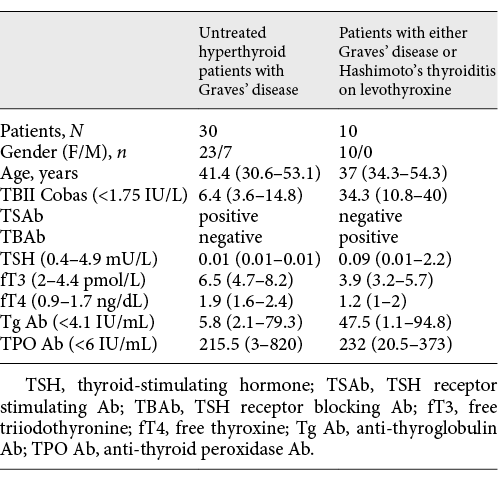 The demographic and serological data of all 40 investigated patients with AITD are summarized in Table 1. Thirty well-characterized, untreated, hyperthyroid TSAb-positive/TBAb-negative patients with GD were included as well as 10 euthyroid (on levothyroxine) TBAb-positive/TSAb-negative patients with either GD or HT.