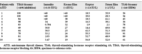 All 30 TSAb-positive GD patients were negative for TSHR blocking Ab as tested in the TBAb bioassay. On the other hand, 10 patients with AITD (GD: n = 6, HT: n = 4) were exclusively positive for TBAb in the TBAb bioassay and were negative for TSAb in the TSAb bioassay. All 10 TBAb-positive/TSAb-negative serum samples tested positive in the 4 binding assays: Immulite, Kronus, Kryptor, and Dynex (Table 3).