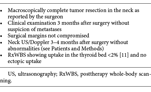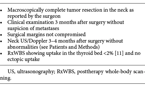 The patients of this study were treated at our hospital between 2006 and 2014. During this period until today, patients with PTC have been evaluated routinely 3–4 months after surgery by US/Doppler. For this study, patients submitted to total thyroidectomy who received RAI and who did not have persistent disease according to the criteria in Table 1 were selected. Patients with poorly differentiated carcinoma and extensive extrathyroid invasion (pT4) were excluded. In addition, to avoid underestimating recurrences, patients with classical PTC ≤4 cm restricted to the thyroid and without vascular invasion were not included. Patients with TgAb were also excluded. Once included in the study, the patients were followed up for 5 years after treatment with RAI as described below.