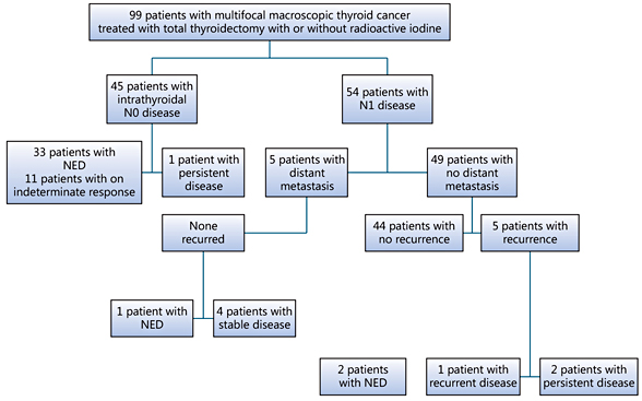 Clinical outcomes of treated patients with multifocal macroscopic thyroid cancer. NED = No evidence of disease.